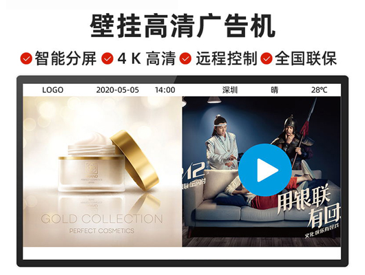 壁掛廣告機是一種全新的媒體概念,指的是在大型商場、超市、酒店大堂、飯店、影院及其他人流匯聚的公共場所,通過大屏幕終端顯示設(shè)備,發(fā)布商業(yè)、財經(jīng)和娛樂信息的多媒體專業(yè)視聽系統(tǒng)。